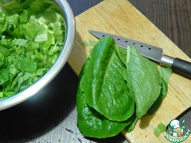 Листья салата промыть, обсушить и нарезать. Для заправки смешиваем оливковое масло с бальзамический уксус и миндальную эссенцию.