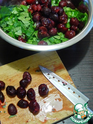 Вишню промыть, так как у меня вишня замороженная я ее мыла горячей водой в дуршлаге, потом сразу нарезала на половинки и отправила к салату.