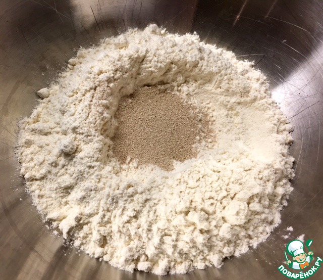 Замесите тесто. Просейте муку, всыпьте дрожжи, сахар и соль.