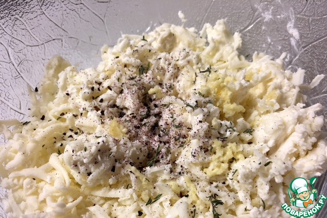 Сделайте начинку. Натрите моцарелла и добавьте сыр рокота. Я для себя поняла, что можно заменить на домашний творог. Если совсем нет вариантов с рокота... Добавьте соль и перец и тимьян. перемешайте.