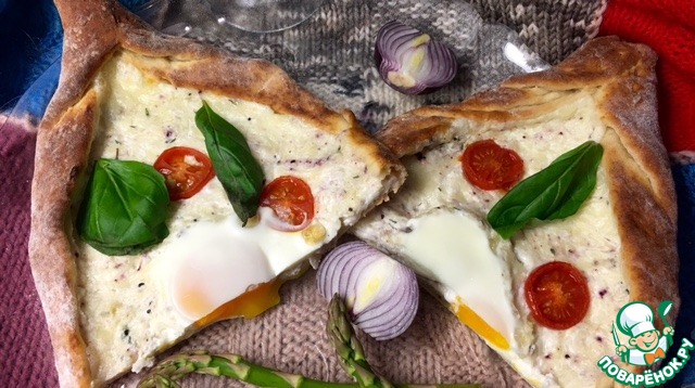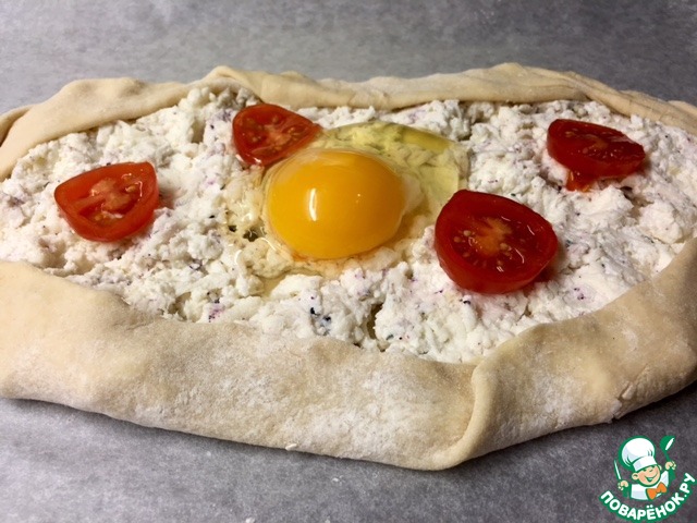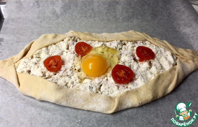 Выложите томаты и разбейте в центр одно яйцо. Остальная начинка, томаты и яйцо пойдут на второе пиде.