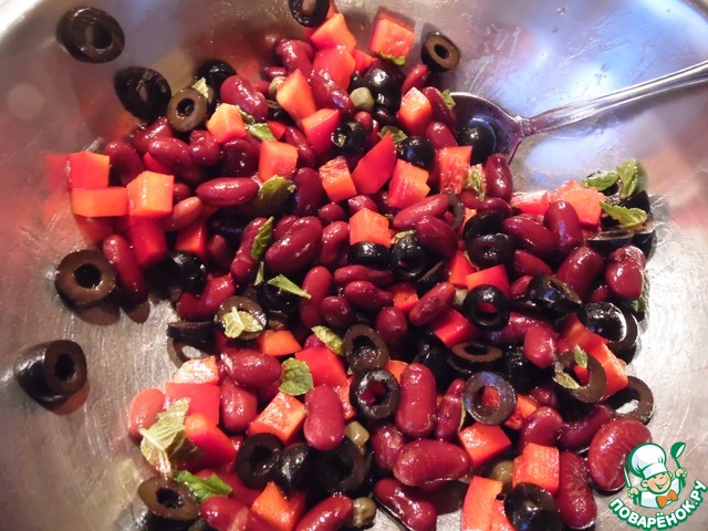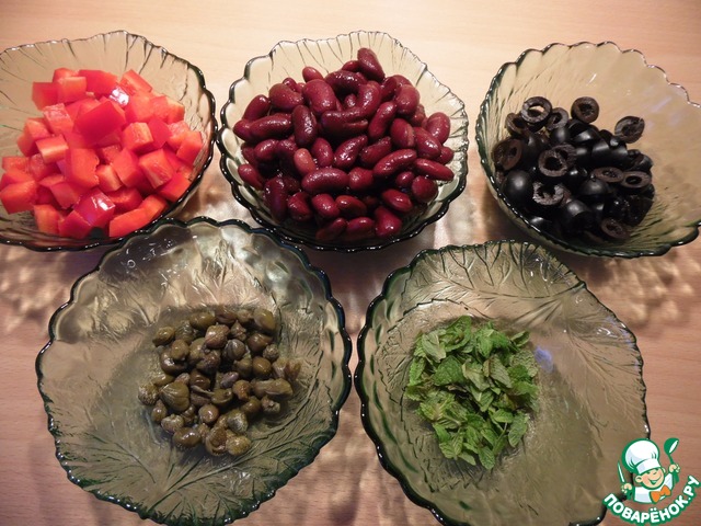 Из фасоли, маслин и каперсов слить жидкость. Маслины нарезать колечками, перец - кубиками, мяту нашинковать.