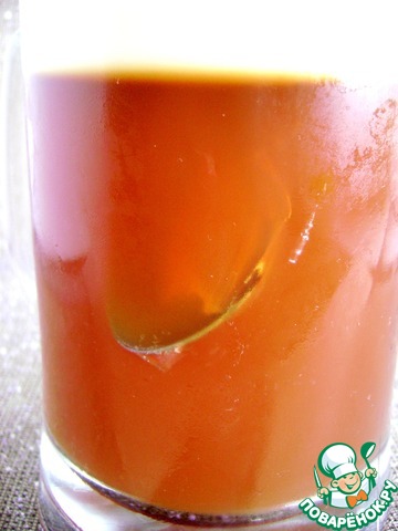 Влить вино и добавить мед. Хорошо размешать жидкость. Мы не любим слишком сладкое, а вам стоит попробовать –возможно, вам захочется скорректировать немного вкус. Должно быть слаще и ярче, чем для питья – желатин возьмет вкус примерно на треть. Вмешать 3\4 набухшего желатина в горячую жидкость, оставив около четверти на "пену". Процедить через сито в пивные кружки, наполняя их на две трети. Убрать на холод для застывания.