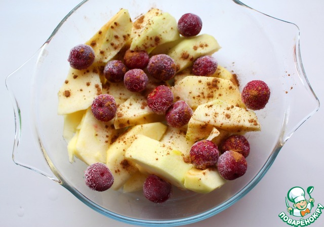 Яблоко очистить от кожуры и сердцевины и нарезать небольшими дольками. Добавить вишни, залить 1 ст. л. воды и присыпать корицей и мускатным орехом.