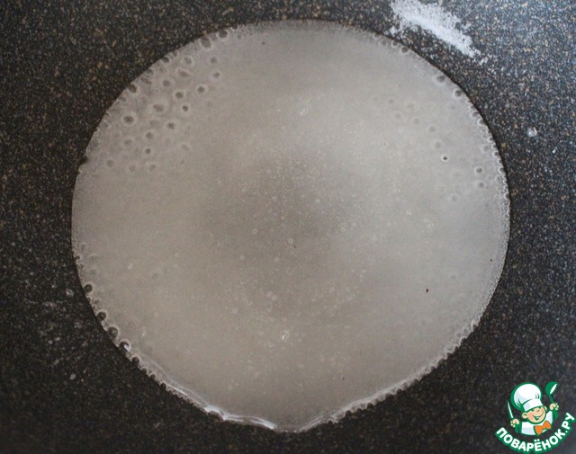 На сковороду с огнеупорным дном добавить сахар и 2 ст. л. воды, довести до кипения.