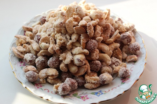 Добавить орехи и тщательно перемешивать до полного выпаривания воды. Когда орехи покрылись кристаллами сахара, переложить в тарелку. (Этот и предыдущий шаги можно пропустить, взяв готовые засахаренные орехи).