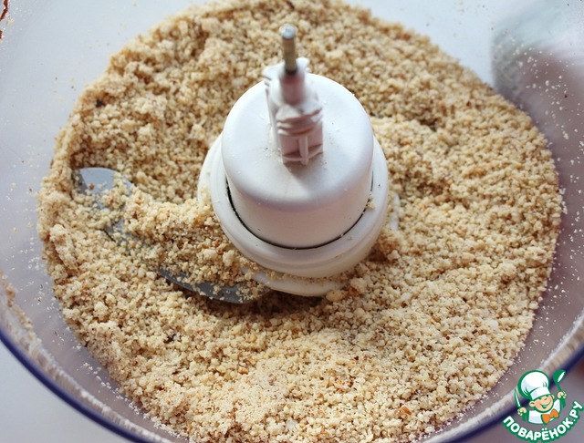 Дать орехам остыть и измельчить в блендере. Разделить на 2 части. 1 часть посыпать поверх одного, смазанного муссом коржа. 2 часть смешать с 3-ей оставшейся частью мусса.