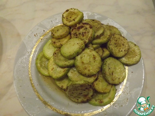 Цукини очистить от кожуры, порезать кружочками и обжарить на сливочном масле до полуготовности, чуть присаливая с каждой стороны.