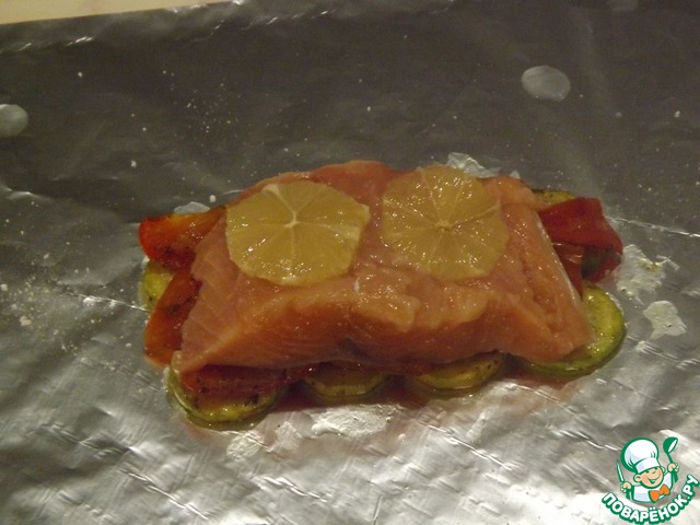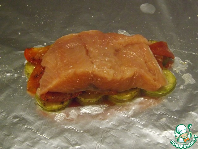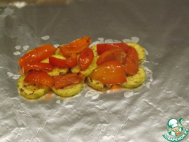 Начинаем собирать наше блюдо. Подготовим 4 листа пергамента или фольги (пергамент предпочтительнее, т. к. фольга рвется, но у нас фольга). Выкладываем слой цукини на каждый лист.