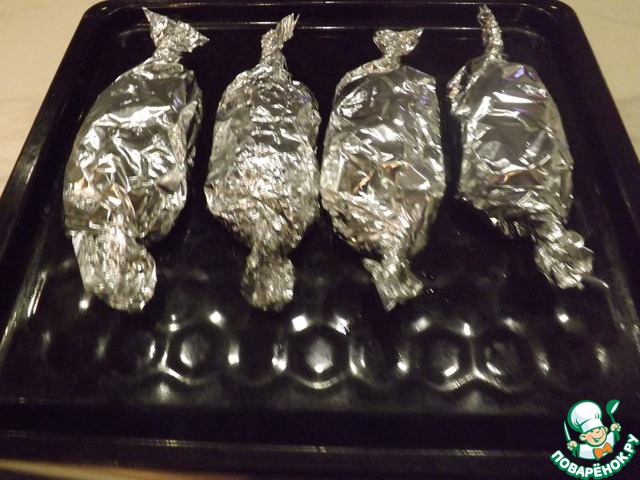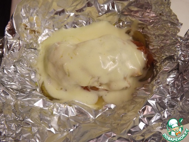 По истечении 20 минут вытаскиваем нашу рыбку из духовки. Подаем прямо в фольге, полив голландским соусом.