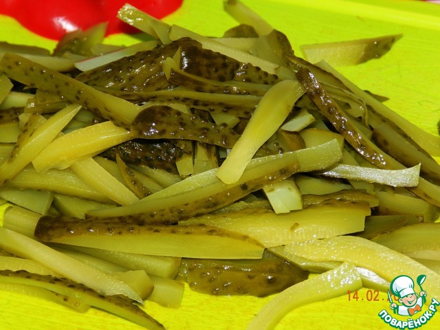 Также, тонкой соломкой, нарезаем маринованные огурчики (у меня примерно 8-10 маленьких корнишонов)