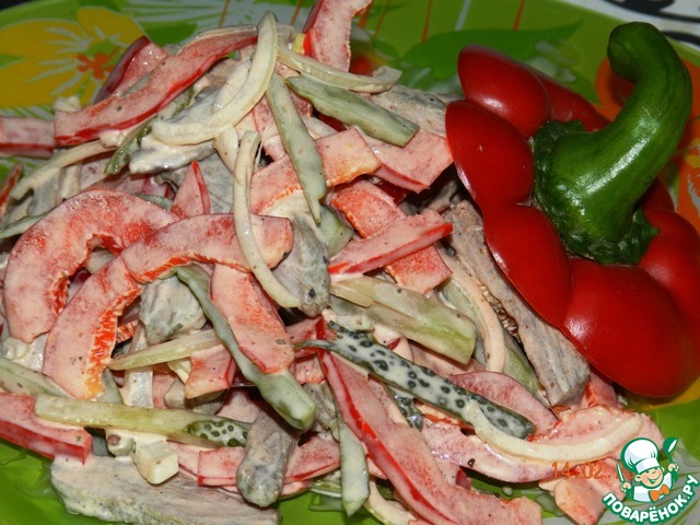 Пока варится говядина, мы нарезаем болгарский перец: удалить сердцевину, разделить на 4 части и нарезать длинными полосочками, достаточно тонко!
