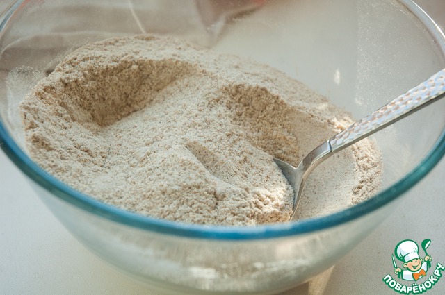 Смешаем все сыпучие ингредиенты: муку цельнозерновую, муку гречневую, сахар и соду.