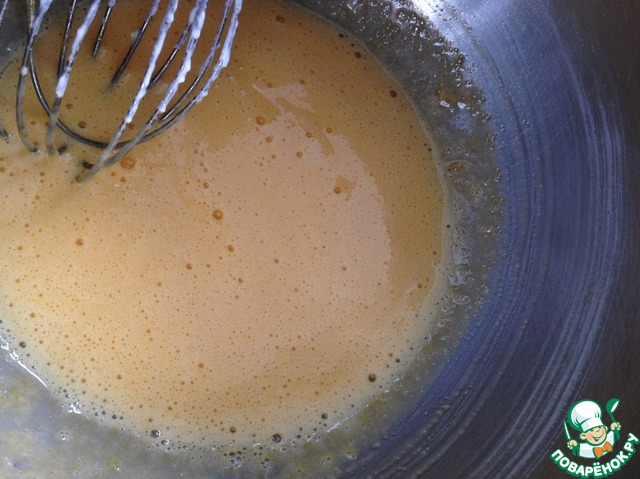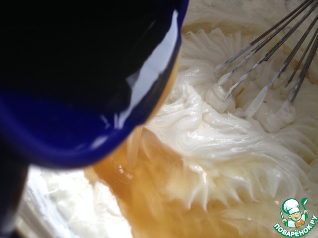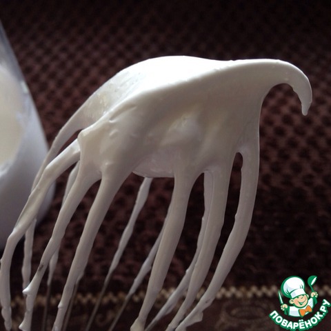 Разделить белки и желтки. Белки взбить до устойчивых пиков, всыпая постепенно 40 г сахара...
