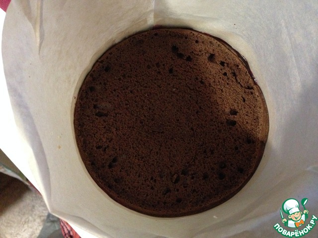 Торт удобно будит собирать в разъемной форме. Предварительно застелив её пленкой или бумагой для выпечки! Поместить шоколадный бисквит на дно формы...