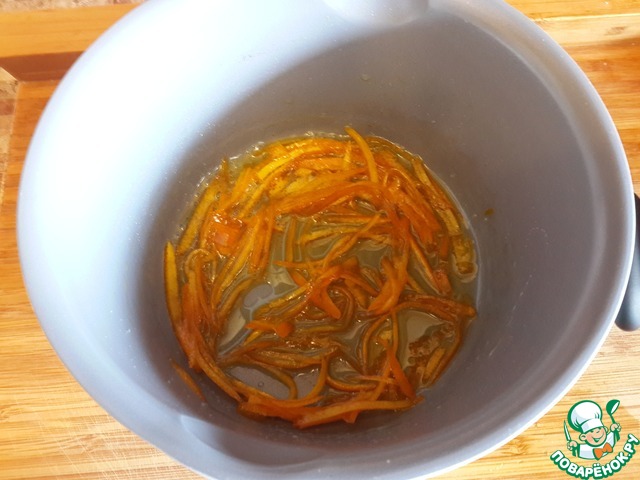 Для украшения в ковшике воду с сахаром довести до кипения, положить в этот сироп нарезанную соломкой цедру апельсина, проварить около 5-8 минут, остудить. Откинуть на сито, чтобы стёк сироп.