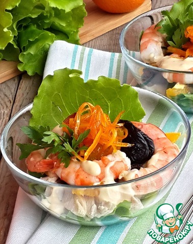 | Лёгкий изысканный салат, почти десертный и явно женский. Сочетание курицы и креветок с черносливом и сладким апельсиновым соусом покоряет с первого раза! Глядя на фото вы подумали, что сверху морковь? А вот и не угадали!!! Заходите - я расскажу что это :-) |