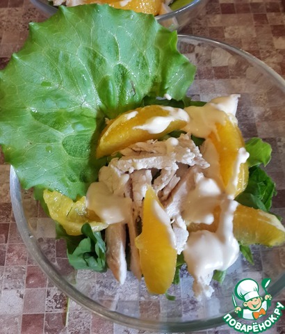 Сверху кладем нарезанное куриное филе и сегменты апельсина, поливаем соусом.