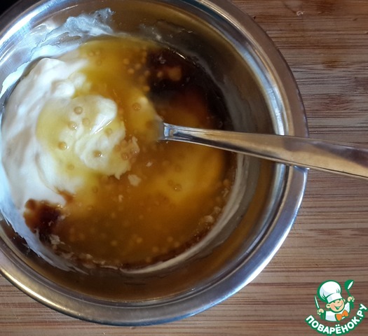 Для соуса смешать майонез с зернистой горчицей, свежевыжатым апельсиновым соком и соевым соусом.
