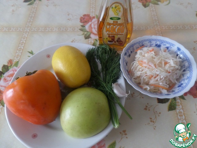 В чашку выкладываем маринованную капусту, яблоко и хурму. Добавляем заправку.