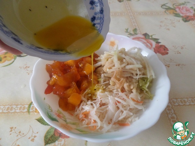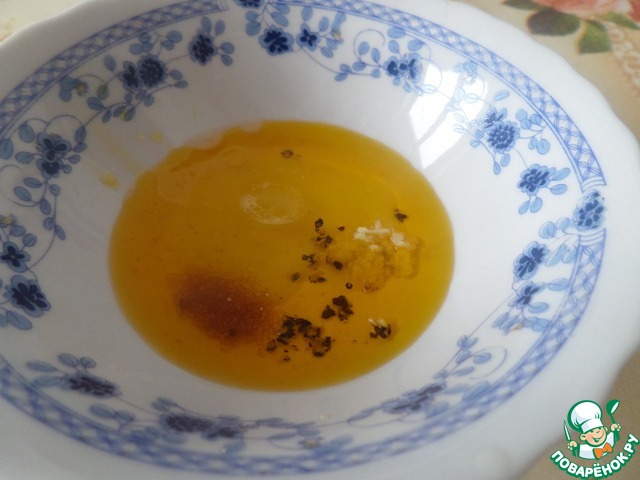 В чашечку наливаем горчичное масло, добавляем лимонный сок, измельченный чеснок и перец. Добавляем по вкусу соль и сахар. Перемешиваем. Заправка для салата готова.