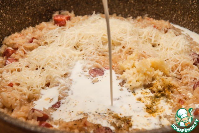За несколько минут до готовности вливаем сливки, добавляем сыр, чеснок, специи и соль, перемешиваем. Накрываем крышкой и даем постоять на медленном огне буквально 2 минуты. Готовое ризотто выкладываем на тарелку горкой, посыпаем зеленью и натертым сыром. Наше блюдо готово, приятного аппетита!