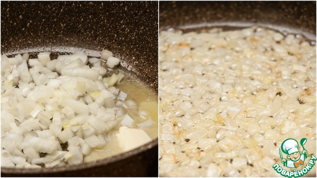 Нагреваем в сковороде растительное масло, добавляем лук, нарезанный кубиком, и кладем сливочное масло. Поджариваем лук до слегка золотистого состояния.