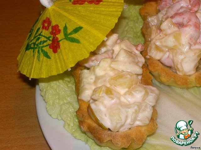 Перемешиваем креветки, нарезанные ананасы и яблоко. Заправляем майонезом.