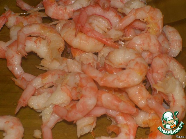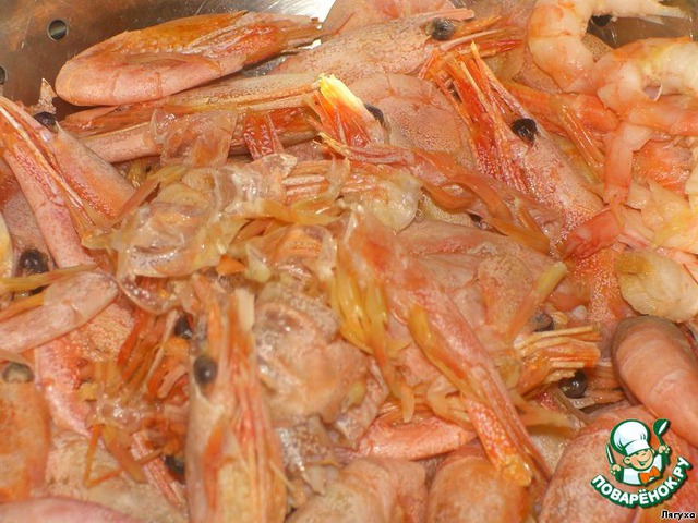 Я варила, как указано на упаковке. Поставила воду с солью и перцем горошком, довела до кипения и забросила креветки. Затем после закипания креветок проварила 3 минуты. Откинула на дуршлаг и дала им остыть.