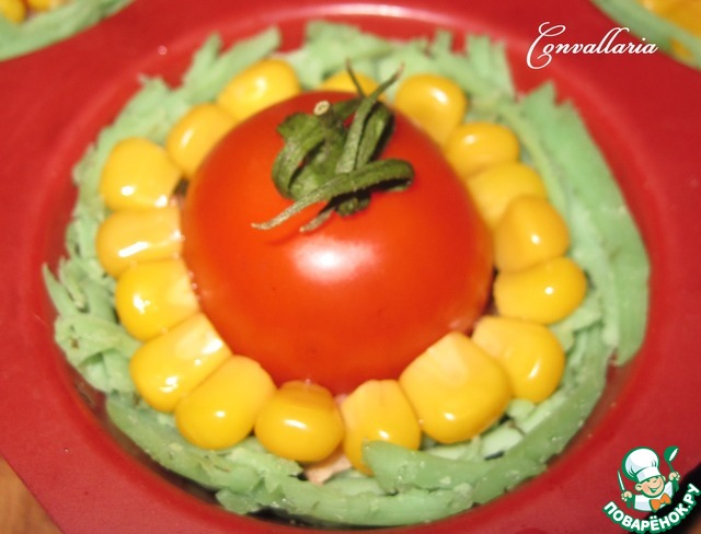 Немного подрезать низ помидоров для устойчивости и выложить поверх рыбы. Украсить зернами кукурузы.