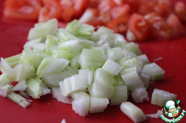 Сельдерей и помидоры нарезать небольшими кубиками.