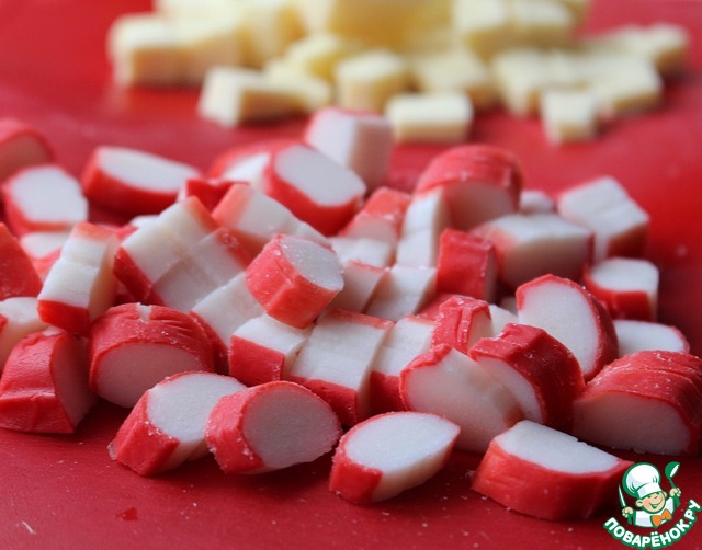 Крабовые палочки и сыр тоже нарезать кубиками.