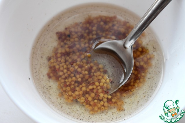 Сделать заправку. Для этого смешать растительное масло, бальзамический уксус, соль, перец и дижонскую горчицу и тщательно перемешать.