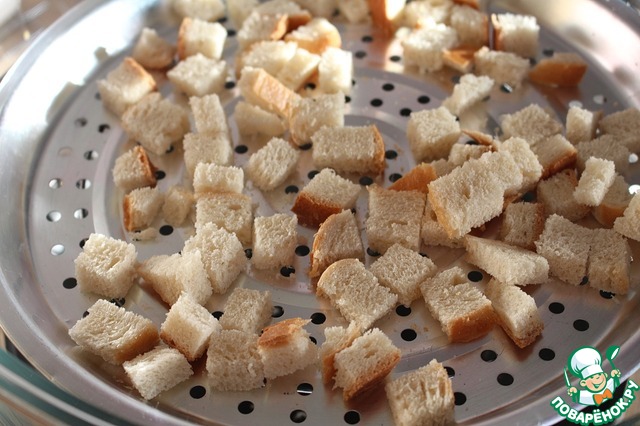 Батон нарезать кубиками, приправить солью и сушеным чесноком. Посушить в духовке.