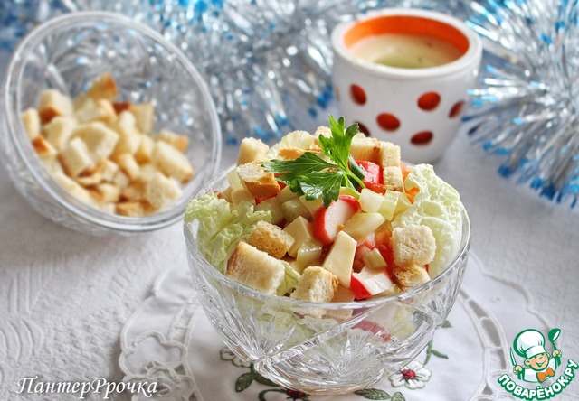 Смешать овощи, сыр и крабовые палочки, заправить. Сухари положить перед непосредственной подачей, что они не размокли.