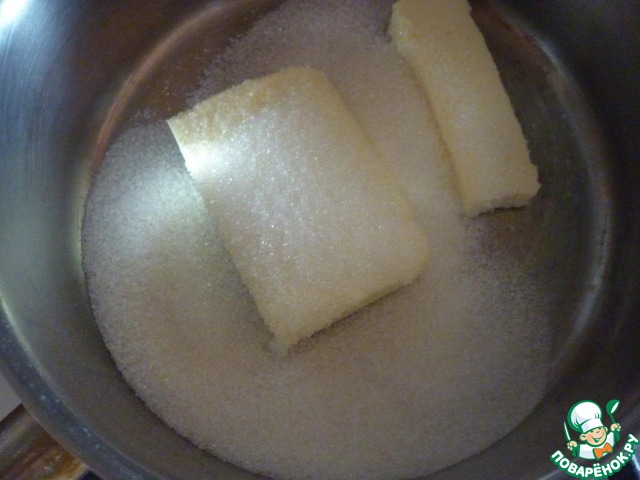Смешать в миске оба вида сахара и сливочное масло. Поставить на плиту на средний огонь и варить, пока кристаллы полностью не растворяться.