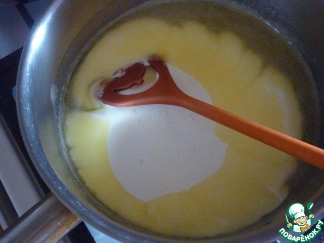Добавить сливки и готовить ещё 5 минут. Снять с плиты и остудить до комнатной температуры.