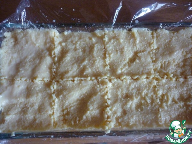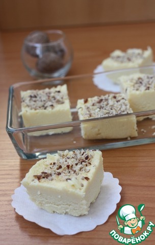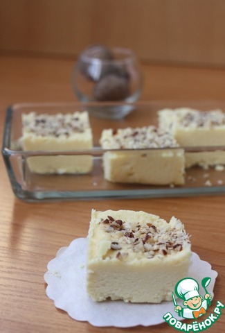 Квадратную форму застелить пищевой плёнкой и выложить подготовленную массу. разровнять мокрыми руками. Сделать на ней ножом видимые надрезы, как бы разрезая на квадратные порции. Сверху можно посыпать молотыми орешками, можно целыми, как Вам захочется.