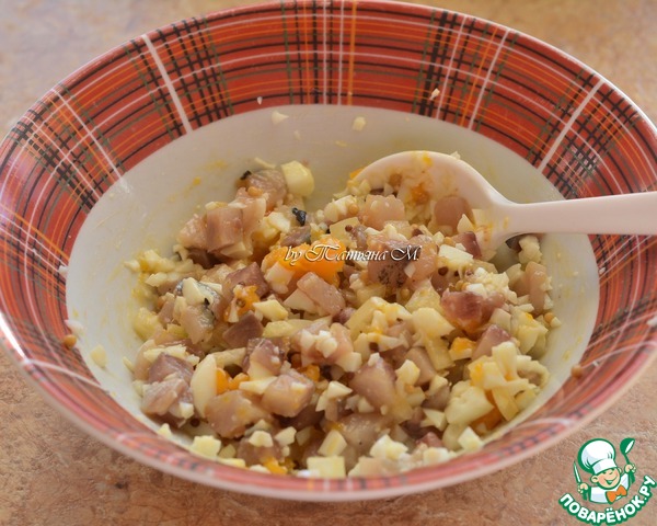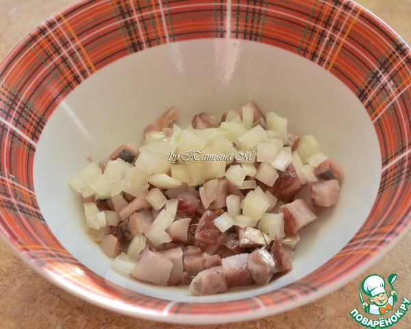 Сельдь и лук порезать мелкими кубиками.