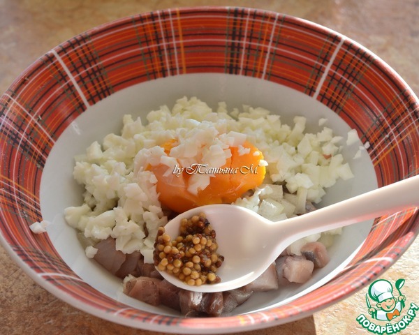 Добавить рубленный мелко белок и горчицу.