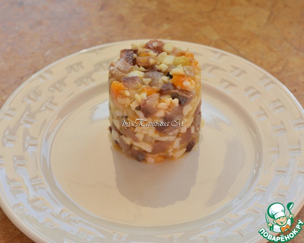С помощью кольца, выложить на тарелку селедочную основу (половину).