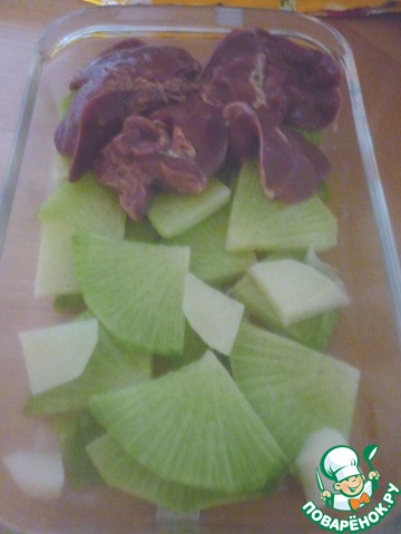 Дно формы смазать маслом. уложить на дно очищенную и нарезанную зелёную редьку, посолить, далее сверху выложить промытую печень