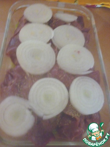 Посыпать тимьяном, ну а сверху печени выложить нарезанный на кольца лук. Закрыть фольгой и поставить в разогретую духовку до 190С на 25-30 минут.