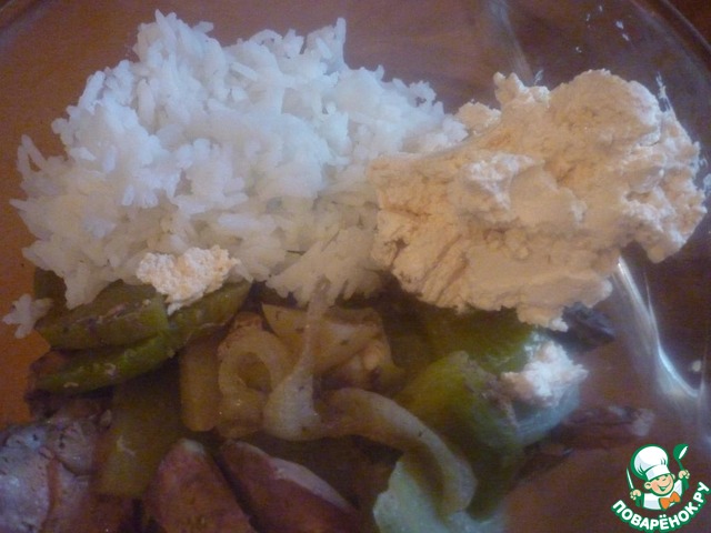 Когда овощи с печенкой будут готовы, достать, но без образовавшейся жидкости (её можно использовать куда нибудь вместо бульона в другом блюде). К ним отправить рис и творожный сыр, всё взбиваем. Откорректировать на соль.