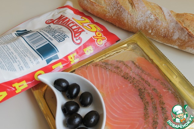 Итак, берем оливки, красную рыбу, любую, слабосоленую, багет, сыр и майонез.