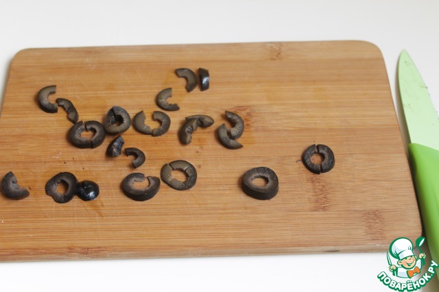 Оливки берем черные, нарезаем их кольцами. И еще режем пополам.