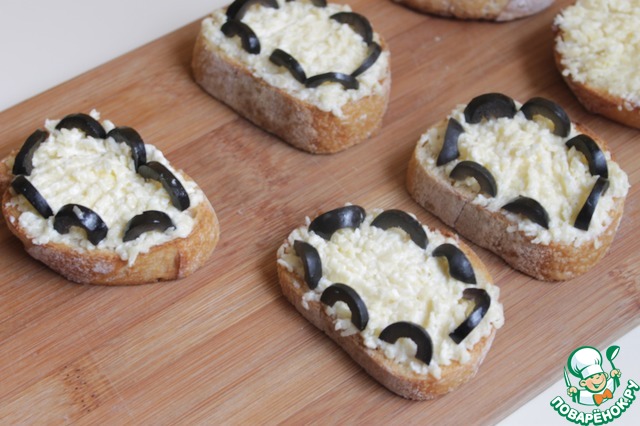 Намазываем хлеб смесью сыра и выкладываем по краям оливки.