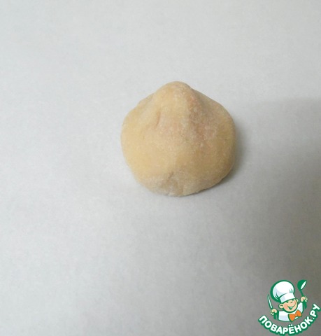 Затем защипнуть концы и нужно покатать в шарик, затем положить шарик швом вниз, верхнюю часть чуть сформировать путём нажатия руками