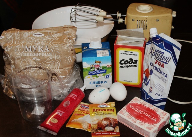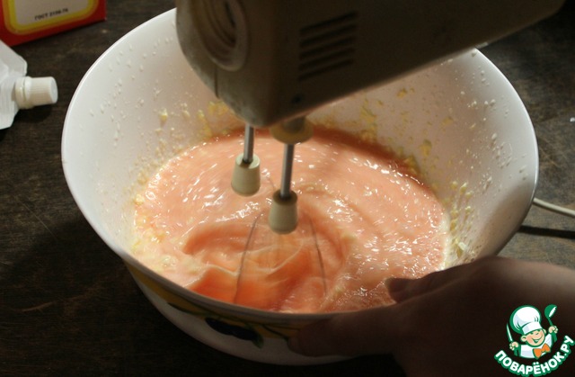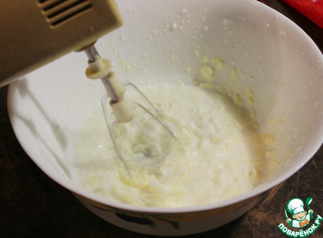 Теперь смешиваем все эти ингредиенты вместе (в том числе добавляем сахар и ванильный сахар). Хорошенько взбиваем миксером. По густоте напоминает сметану, нежнейший крем. Смесь не должна быть похожей на воду - это значит что вы не доложили муки. Так же она не должна слипаться в "тесто".
