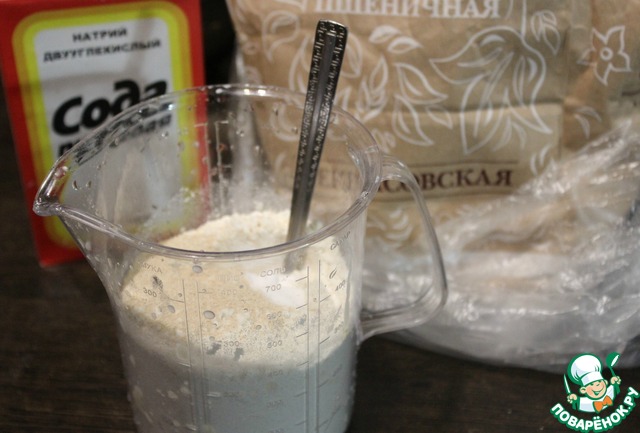 В другом "сосуде" смешиваем ложечкой муку, соду и сухие дрожжи.
